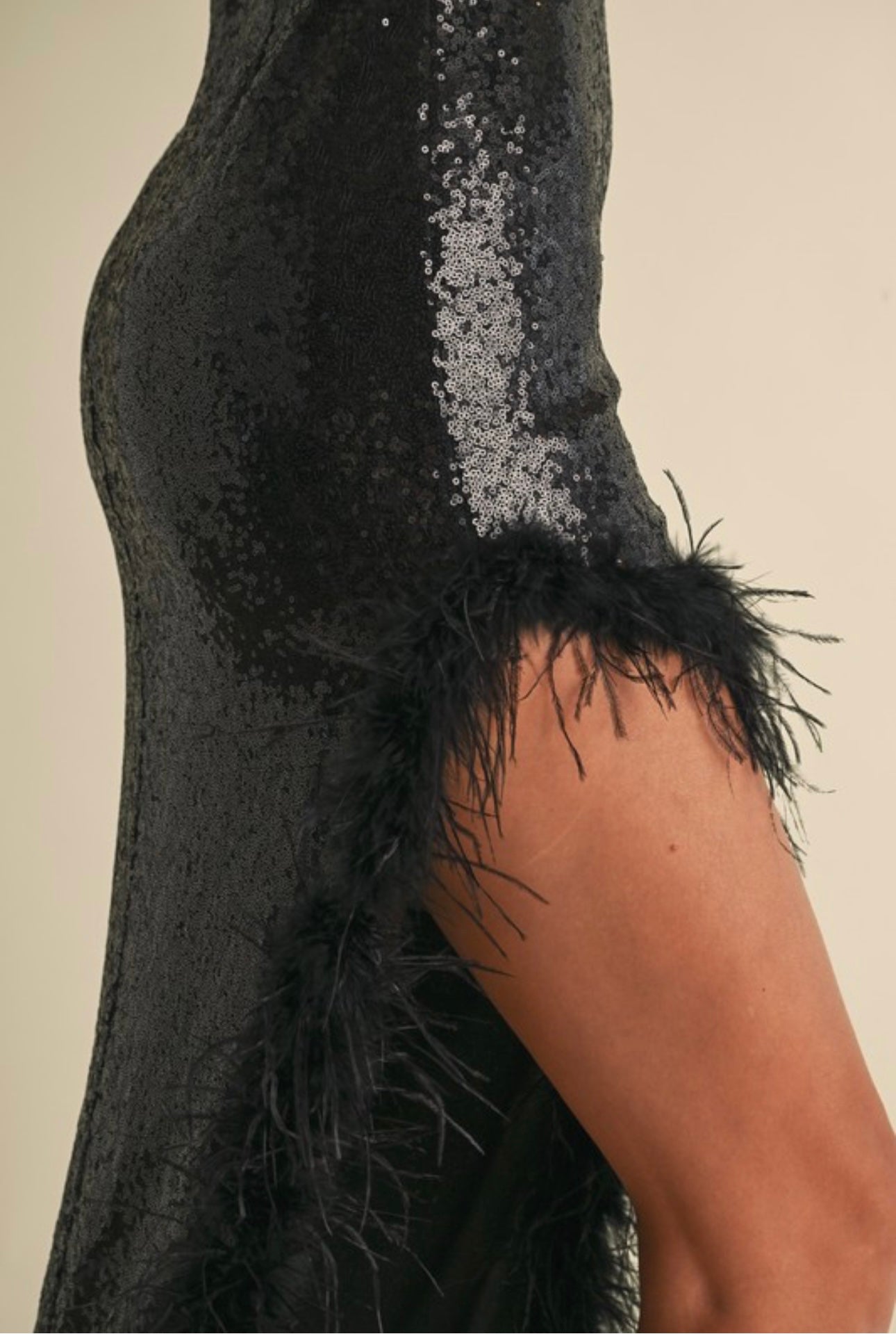 Este traje tiene todo lo que necesitas para lucir como la reina de la noche. Tiene un negro dramático combinado con lentejuelas, plumas, un escote espectacular y una abertura que complementa la belleza del estilo.