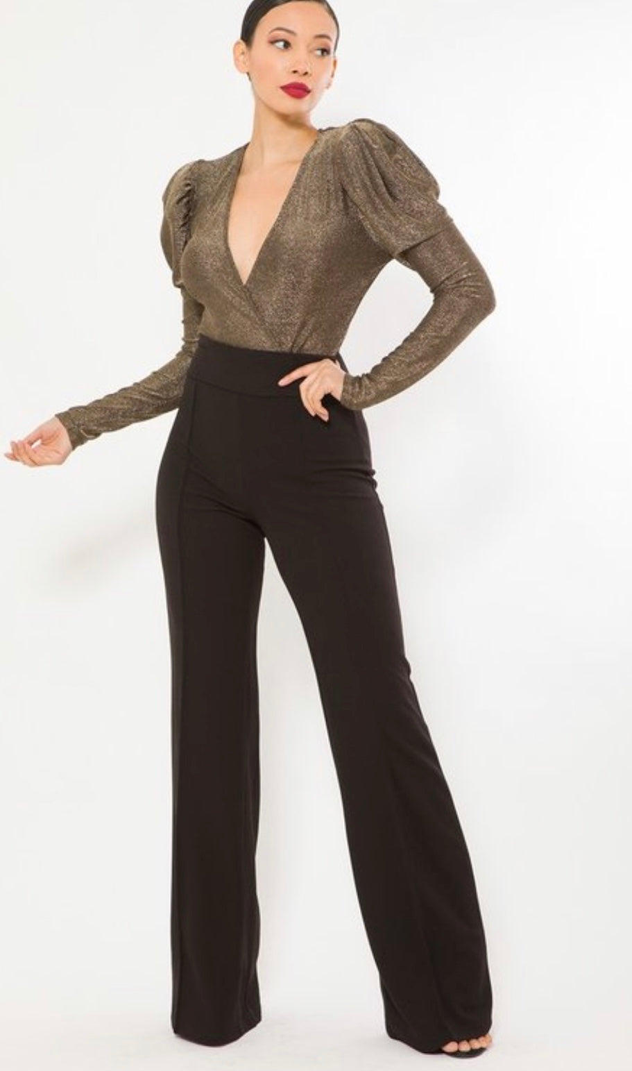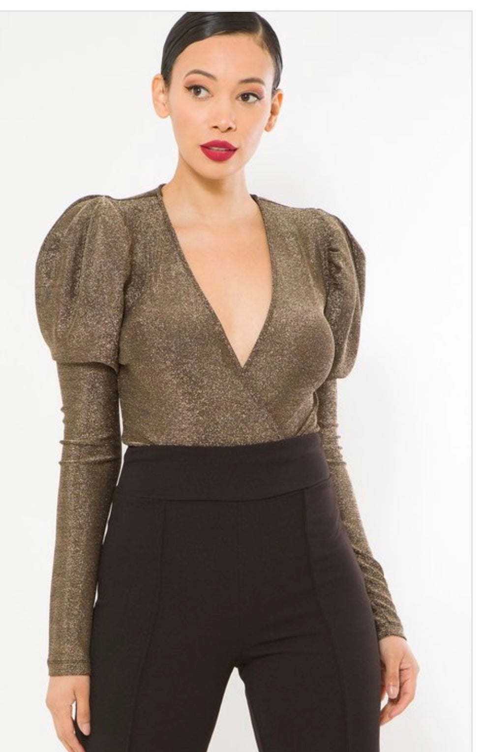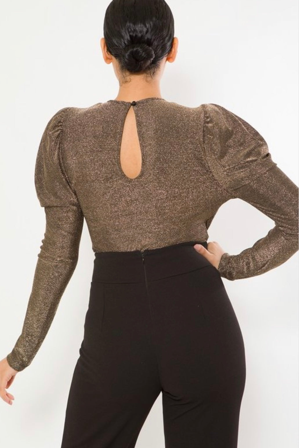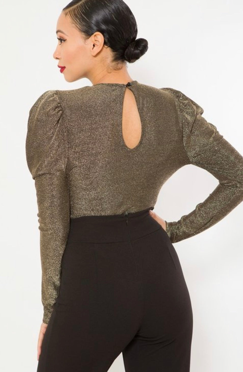 Este top tan hermoso tiene las mangas mas elevadas en los hombros, es bodysuit para un hermoso ajuste al cuerpo, con detalles metálicos y mangas espectaculares largas
